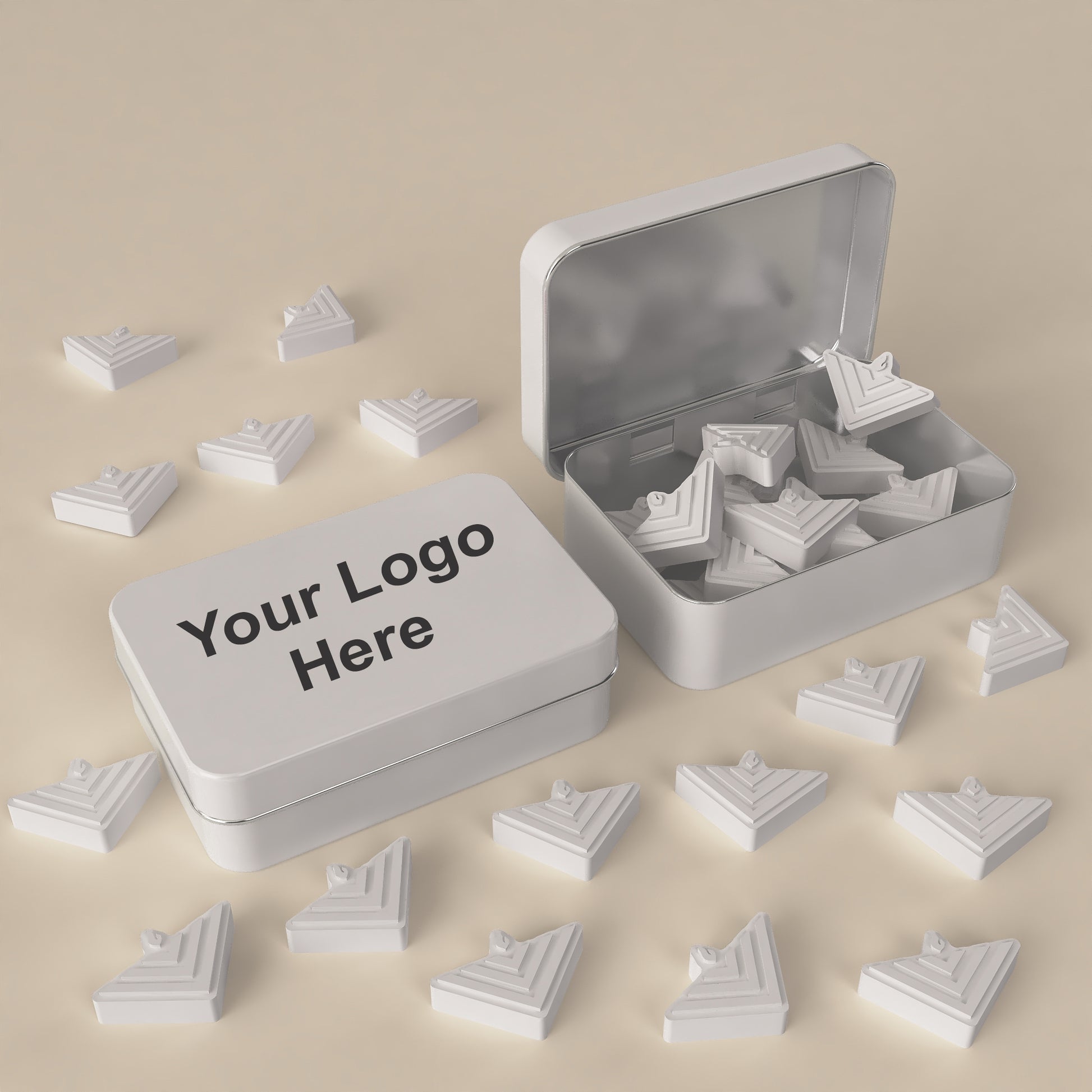 Turn your brand into a refreshing giveaway. With our fully custom shaped mints, your logo, product, or symbol becomes the mint itself — embossed in detail and packed into a reusable tin printed in full color with your design. Perfect for trade shows, client gifts, and promotional events.